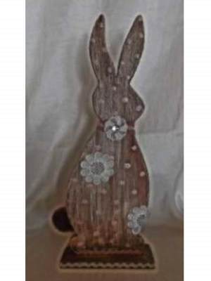 Χειροποίητο Ξύλινο Ντεκαπέ λαγουδάκι καφέ ροζ πουά δαντέλα στρας καφέ ουρά από φελτ τρέσα