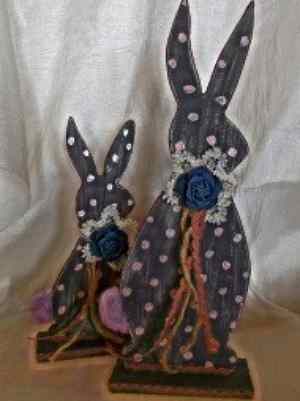 Χειροποίητο Ξύλινο Πασχαλινό Λαγουδάκι γκρι ντεκαπέ χρώμα κιμωλίας ροζ πουά μπουτονιέρα δαντέλα τζιν τριαντάφυλλο λιλά φελτ μάλλινη ουρά τρέσα λινάτσα κορδόνι
