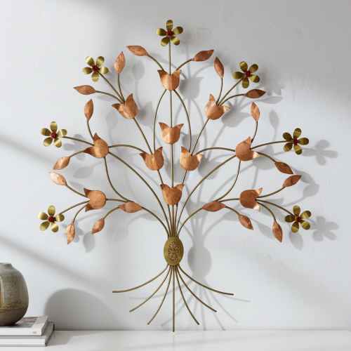 χειροποίητο μπρούτζινο μπουκέτο διακοσμητικό τοίχου τζάκι με χάλκινα φύλλα και χρυσά λουλούδια κρυστάλλινες χάντρες μπρούτζινη πόρπη 60 Χ 50