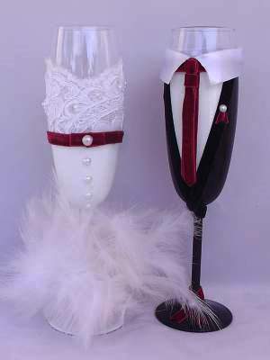 Χειροποίητα ποτήρια σαμπάνιας γάμου γαμπρός ζωγραφιστό μαύρο κοστούμι μπορντό γραβάτα λευκό σατέν πέρλα νύφη δαντέλα σαντιγί φούστα από πούπουλα που αφαιρείται ζώνη μπορντό βελούδο (δυνατότητα επιλογής χρώματος και μονόγραμμα / ημερομηνία από στρας κρυσταλλάκια που επιθυμείτε με επιπλέον κόστος 5 ευρώ σημειώστε στις Επιπρόσθετες πληροφορίες στην ολοκλήρωση της παραγγελίας)