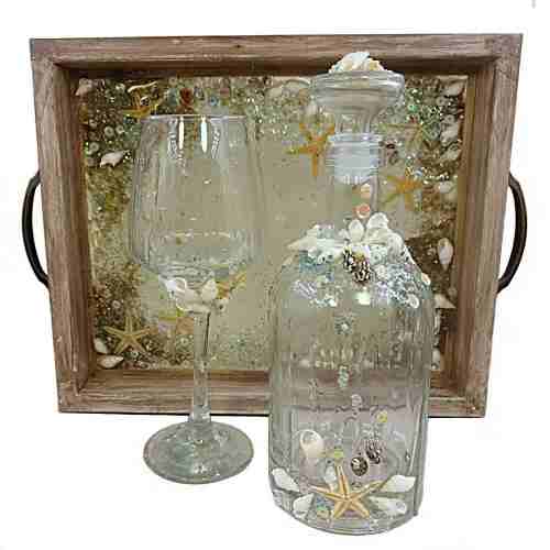Χειροποίητο σετ γάμου δίσκος 34 Χ 25 ξύλινο πλαίσιο μπρούτζινα οξειδωμένα χερούλια κοχύλια άμμος αστερίες σπασμένο γυαλί γκλίτερ εγκλωβισμένα΄σε υγρό γυαλί με αντοχή στις υπεριώδης ακτίνες καράφα 23 Χ 8.5 και ποτήρι κρασιού 21 Χ 8 με κοχύλια και υγρό γυαλί