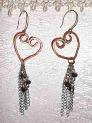 σκουλαρίκια χειροποίητα σφυρήλατος χαλκός σε σχήμα καρδιάς με αλυσιδίτσες και κρυστάλλινες χάντρες
